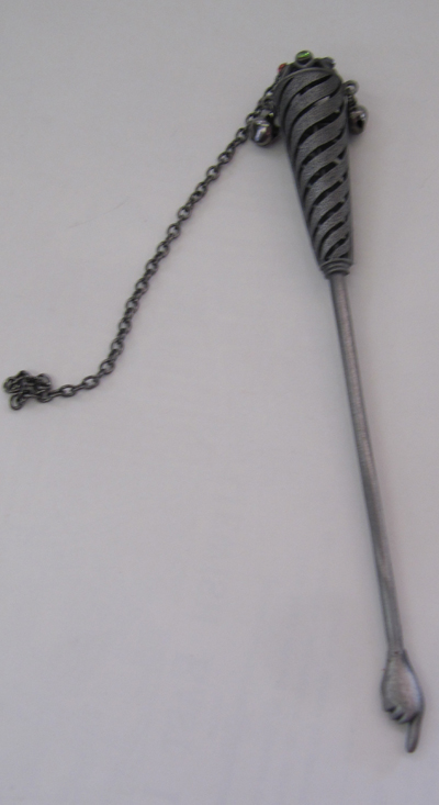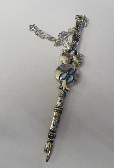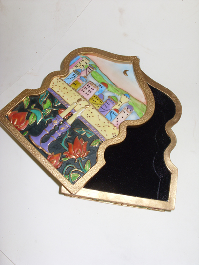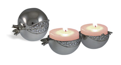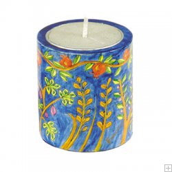 This stunning candlestick sculpture is made out of metal and formed with a laser cut, then hand-painted in beautiful multicolor. The base is a simple rectangle with two cut-outs that fit tea candles inside. A pomegranate is painted in between the cut-outs and leaves are painted all over the base. Behind the candle holders, a beautiful tree is blooming with many colored birds and pomegranates on its branches. It is a stunning piece of art that can really light up a room!
