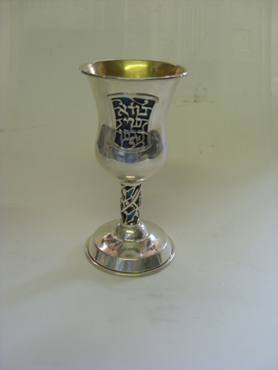 Ornate Silver Israeli Kiddush cup, inset blue Enamel design. 15cm high