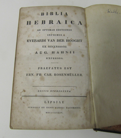 Biblia Hebraica Ad Optimas Editions Inprimis Everardi Van Der Hought. Lipsiae, 1834. Binding worn & detached spotting o/w good.