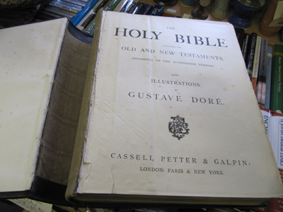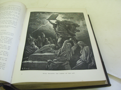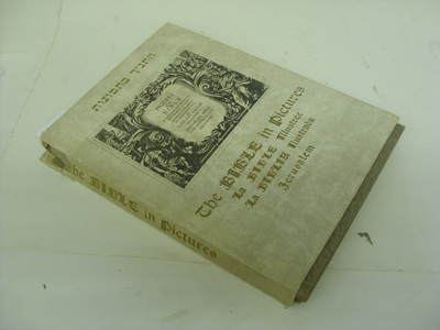 Illustrated Bible, Dore illustrations, 125 b/w plates with text in Hebrew & English. Owners inscription. Ornate padded covers with inset motiv of Davids Tower 19x16cm. Good Condition