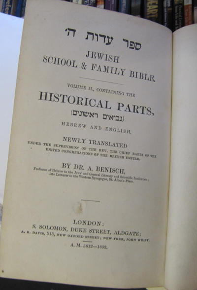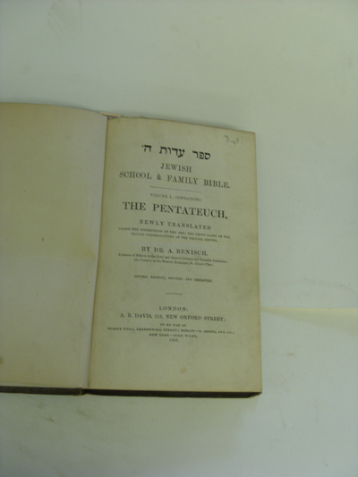 Jewish School & Family Bible, Volume 1. Containing the Pentateuch London, 1852. Hardback. Bookplate Asher Myers. Scuffed good condition.