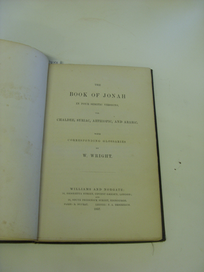 The Book of Jonah in Four Semitic versions, vz. Chaldee, Syriac, Aethiopic & Arabic, London 1857. Slim hardback, top of spine torn o/w good copy.