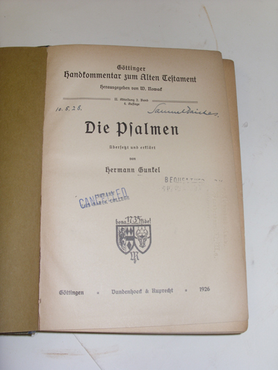 Herman Tunkel: Die Psalmen. Gottingen 1926. Hardback. Cover worn. Tape repair to spine, ex-library. Copy of David Daiches good internally (54333)