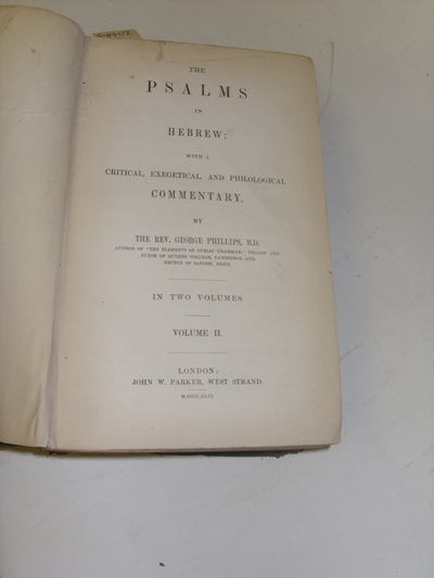The Psalms in Hebrew with a critical, exegetical & philological commentary. London 1846. 2 vols. Boards loose. Spines torn with loss. Internally good (54402)
