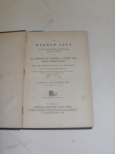 The Hebrew text of the Old Testament, Revised from critical sources. London. Samuel Bagster. 1855. Scuffed spine. Some spotting to prelims. Good condition (55030)
