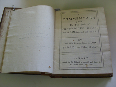 A Commentary Upon the Two Books of Chronicles: Ezra, Nehemiah and Esther by Symon, Lord Bishop of Ely. Pub. London 1706. Full leather binding, New spine. Ex-Library copy. Good
