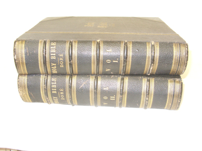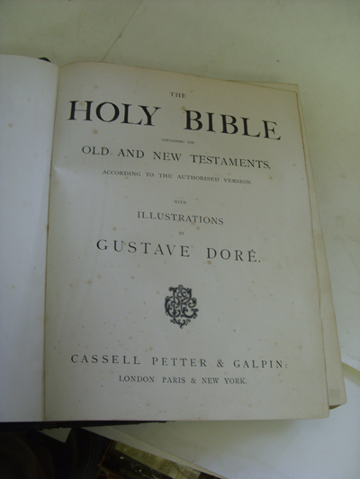 The Holy Bible Containing The Old & New Testaments, According to the authorised version with 220 illustrations by Gustave Dore. Cassell (1880) 2 gilt, Half Calf folio Volumes. Light foxing. One volume loose in binding o/w in good condition.