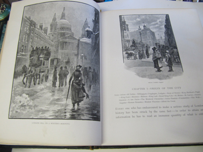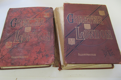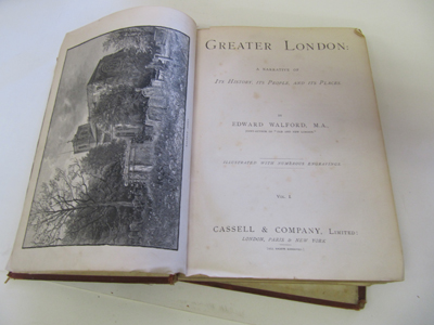 Edward Walford: Greater London. 2 Vols. 1890's. Illustrated with many wood engravings. Covers are worn stained & loose. Internal spotting o/w plates are generally clean.