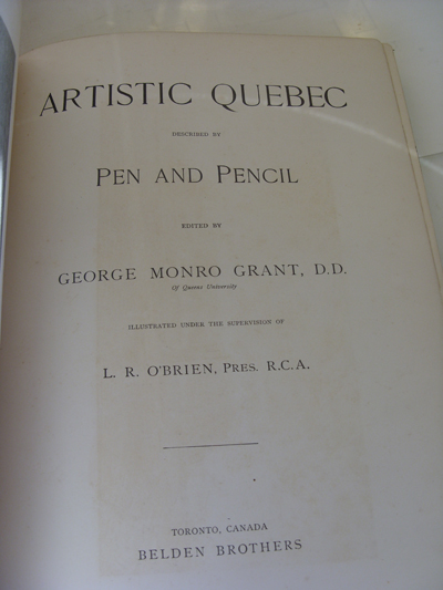 George Grant: Artistic Quebec described by pen & pencil pub Belden Bros. Toronto 1888. Large hardback. Green cloth, Gilt. Steel engraving frontis plate and wood engravings. Spine scuffed o/w good condition