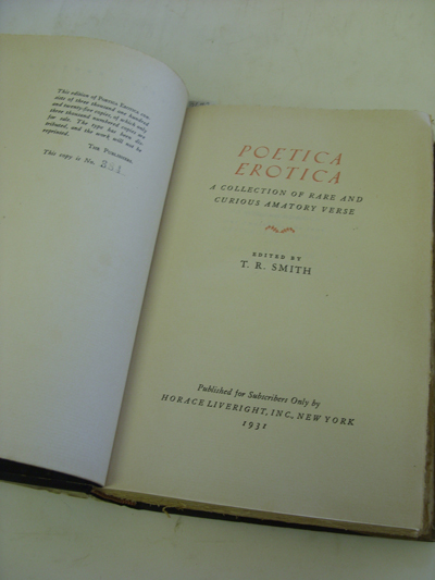 T.R.Smith: Poetica Erotica, A collection of rare and curious amatory verse. New York 1931. Limited to 3125 copies, number 384. Hardback with scuffed dustjacket. Pages uncut. Good condition