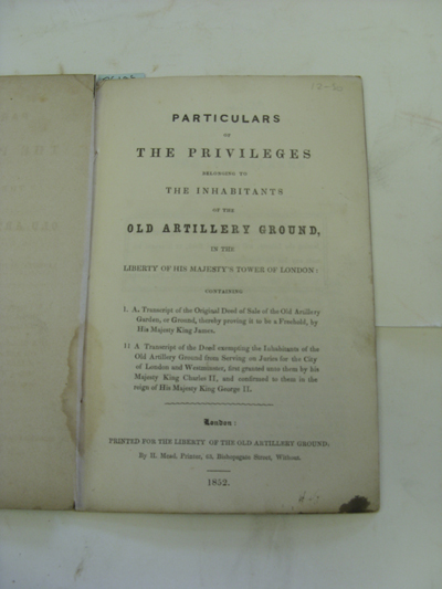 Particulars of the privileges belonging to the inhabitants of the old artillery ground. In the library of His Majesty's Tower of London. Printed by H.Mead, London 1852. Paper covers. pp.19. Copy of P.Solomon, Vestryman. Covers scuffed. Good