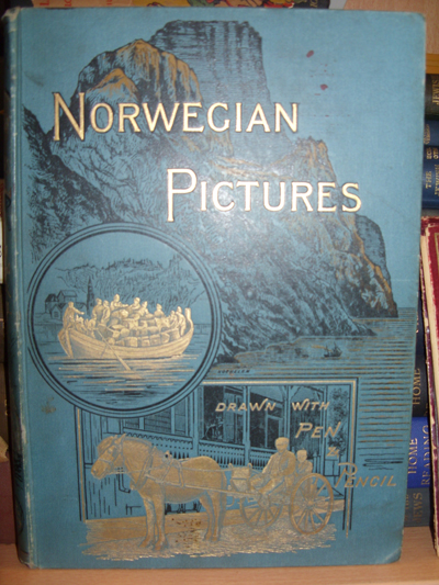 Richard Lovett: Norwegian pictures drawn with pen & pencil London 1885. Decorative covers with a map and 127 illustrations. Inscription to end paper. Sl. Scuffed o/w good condition