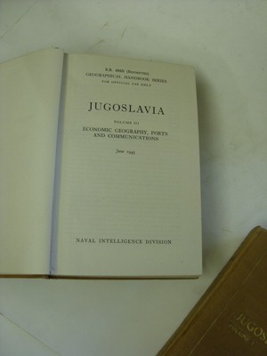 Geographical handbook Series, Jugoslavia. 3 vol set. London 1944. Ex-libary copies. Lacks map in rear pocket to vol 1. Good condition.