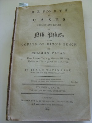 Isaac Espinasse: Reports of cases argued and rules at the courts of king's bench and common pleas. Vols 1&2. 2nd edit. London 1803. Lacking front board. Scuffed. Good
