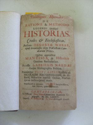 Degoreo Whear: Relectiones Hyemales De Ratione & Methodo Legendi Utrasque Historicis. Cantabrigia, J.Hayes. 1648. Hb. Calf spine. Scuffed, Some edge loss to title pages o/w good