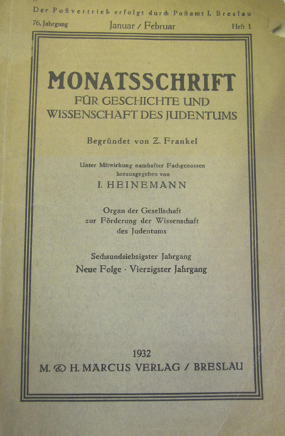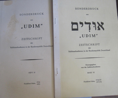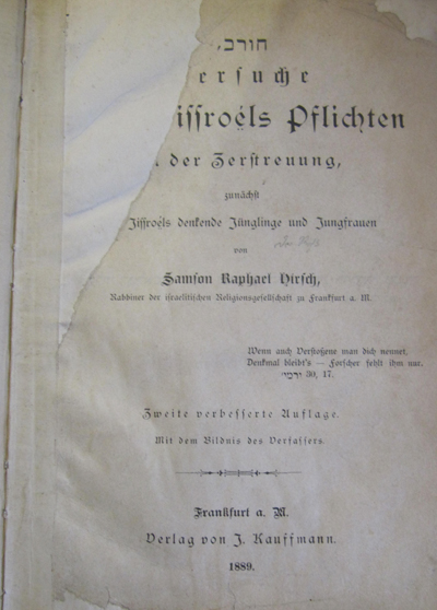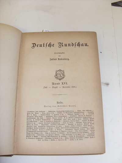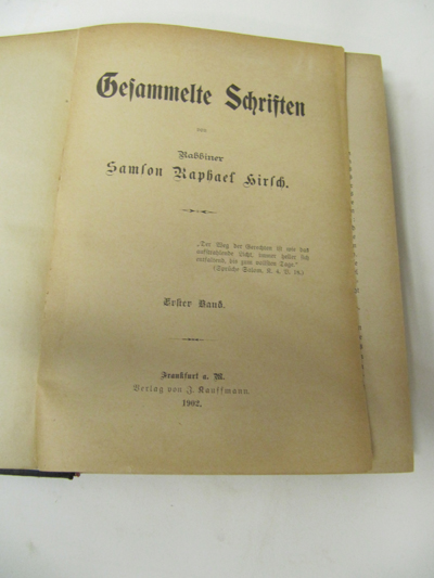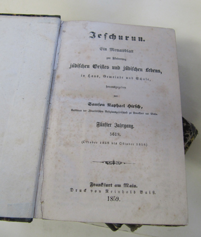 Yeschurn. Ein Monatsblatt Zur Forderung Judischen Geistes Und Judishen Lebens. Frankfurt 1854-1861. 6 Vols lacking Vol 4. Jeschurun was a magazine published & mostly written by R.S.Hirsch light spotting. Good condition.