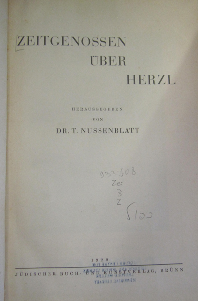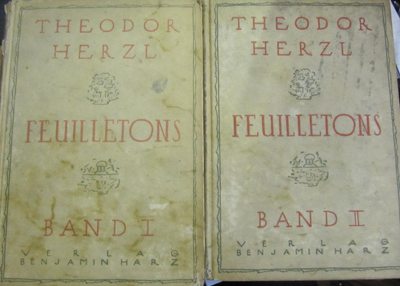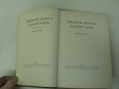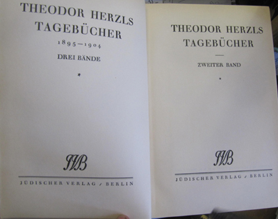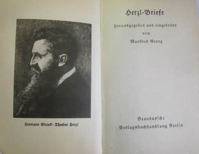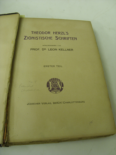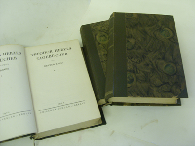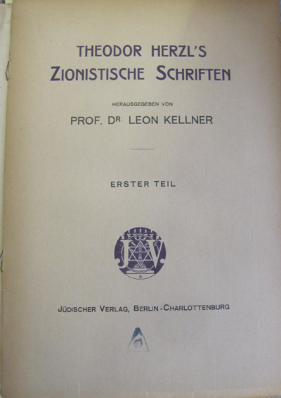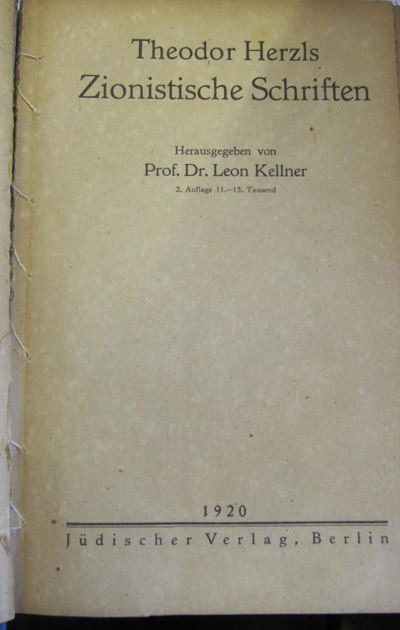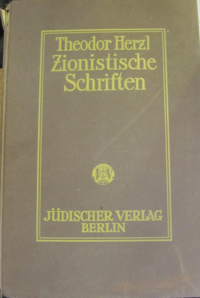 Theodor Herzls Zionistische Schriften. Berlin 1920. Plain blue cloth, SL. Pulled. Good.