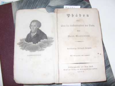 Phadon oder uber die unsterblichzeit der teele. Pub Hildburghausen 1830. Lacking covers. Scuffed. Frontis portrait. Good internally