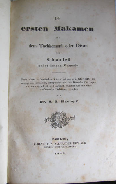 Die Ersten Makamen. Berlin 1845. Plain cloth binding. Some spotting. Good