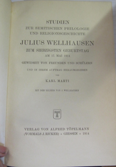 Studien Zur Semitischen Philologie Und Religionsgeschichte Julius Wellhausen Giessen 1914. Library binding. Good.