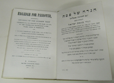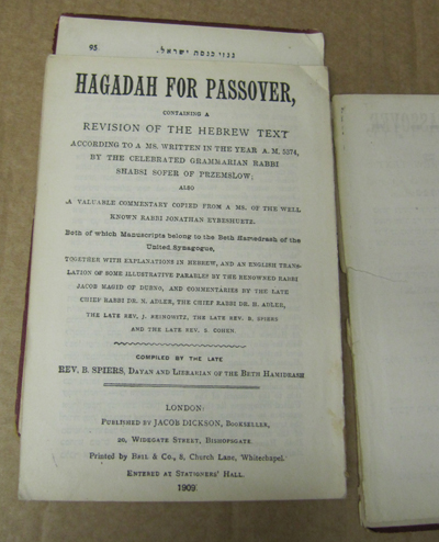 Rev. B. Spiers: Hagadah for Passover. Hebrew / English text with notes. London 1909. Covers detached, Lacking spine. Internally clean.