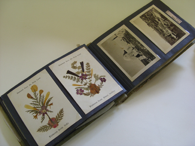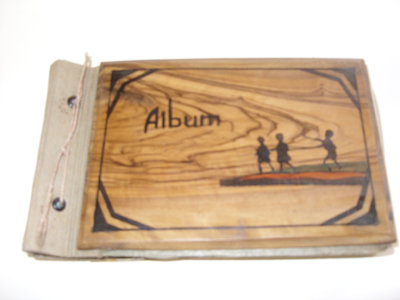 Olive wood photo album with pressed flowers, owners inscription for 1944. 12 cards of actual flowers with descriptions and 30 actual b/w photographs of Jerusalem etc. Certificate of pilgrimage to church of holy sepulchre. Nice condition