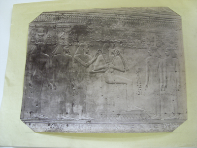 Beato photograph, wall relief showing 4 figures carrying a model boat. 26x21cm, circ 1890.