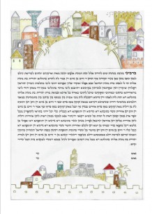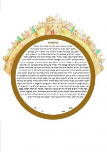 Jerusalem ‘One will again hear in the cities of Judah and streets of the Jerusalem … The sound of rejoicing and the sound joy – the sound of the bride and the bridegroom…’. Based on the words of the traditional marriage blessing, the sheva brachot – Na’amah Ben Eliezer, a young Israeli artist, has incorporated the Ketubah into a picture of the old city of Jerusalem rejoicing with the bride and bridegroom.
