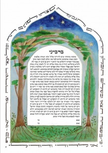 In Talmudic times, it was customary to plant a cypress tree at the birth of a girl, representing beauty, grace and fragrance, and to plant a cedar tree at the birth of a boy, representing majesty, strength and uprightness. Later, branches from these trees were used to make the chuppah for their wedding ceremony. In this ketubah design, Vetta has painted a cypress and a cedar as a frame for the ketubah text, and as a symbol of the chuppah.
